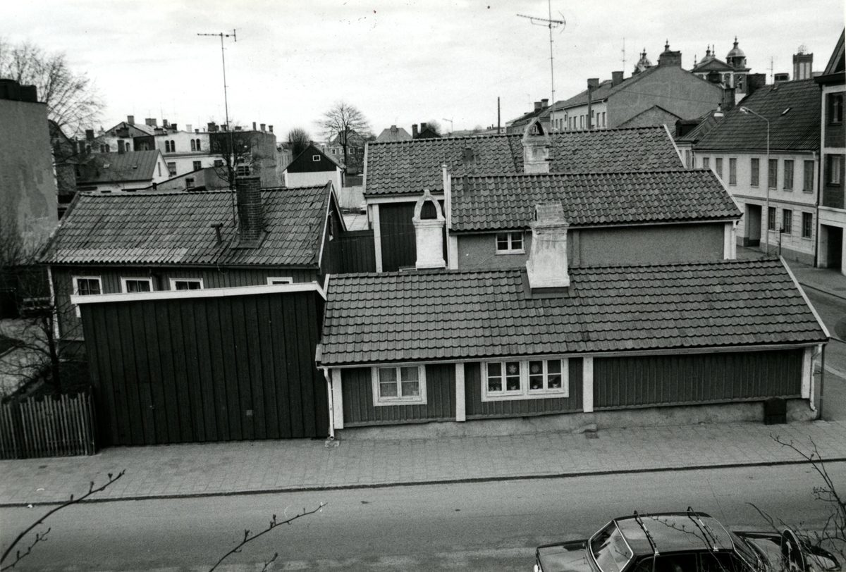 "Tripp,Trapp,Trull" vid Korsningen Larmgatan - Fiskaregatan. Gårdshuset t.v. ligger med gaveln mot den forna Norra Vallgatan och i Larmgatans gamla sträckning.