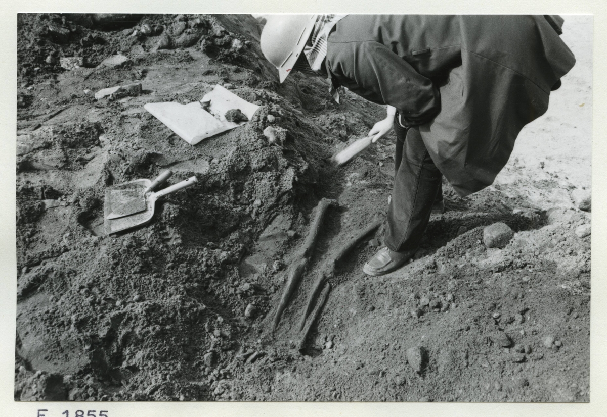 Arkeologisk utgrävning inför utbyggnaden av hotell Witt. Skelettdelar in situ.
