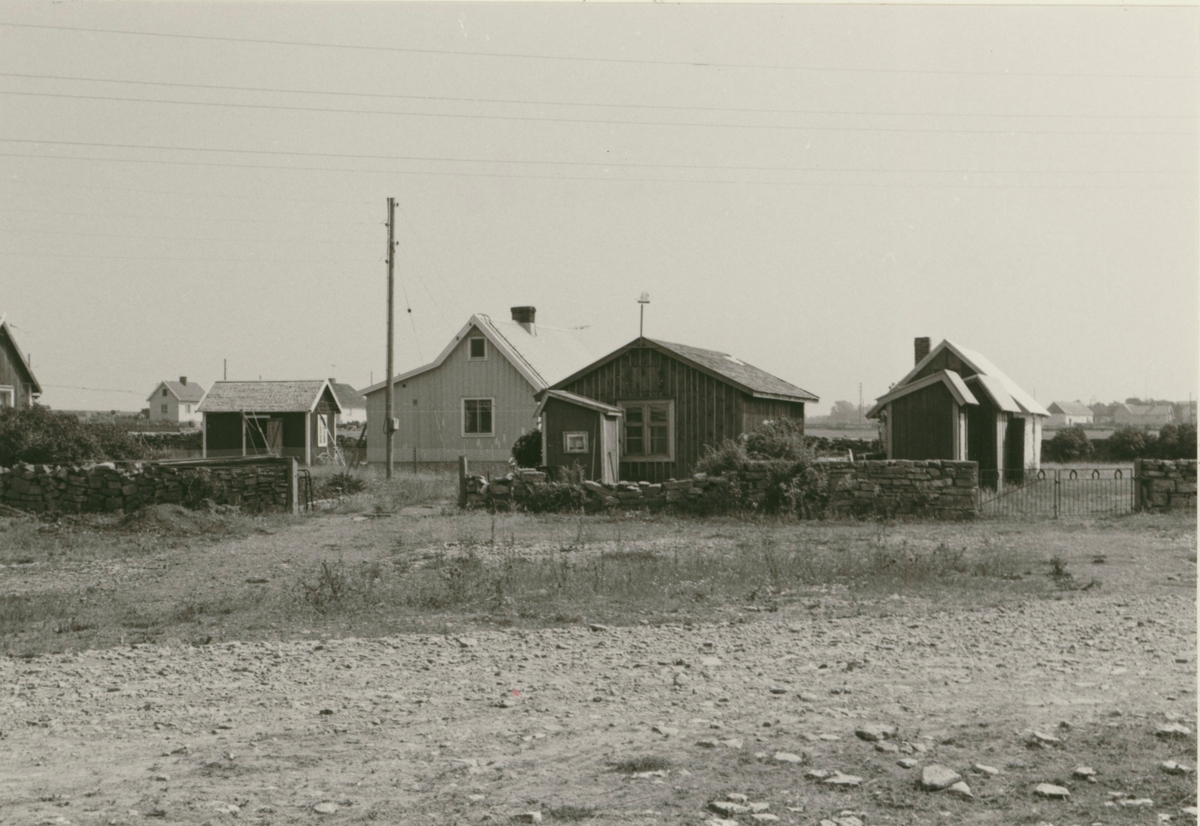 En gård i Klockholm. Några bodar och bostadshus i träfasad.
