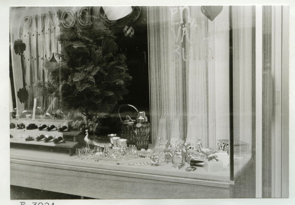 Juvelerare Hentzells skyltfönster. Prydnadsföremål, skrin och smycken.