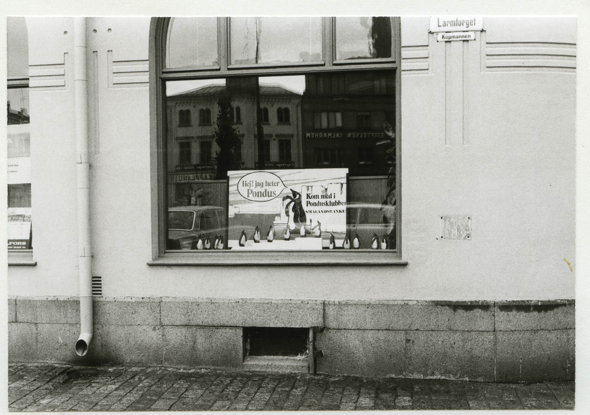 Smålandsbanken på Larmgatan. I skyltfönstret görs reklam för sparbössan Pondus i form av en pingvin. Den lanserades 1967 av Danske Bank.