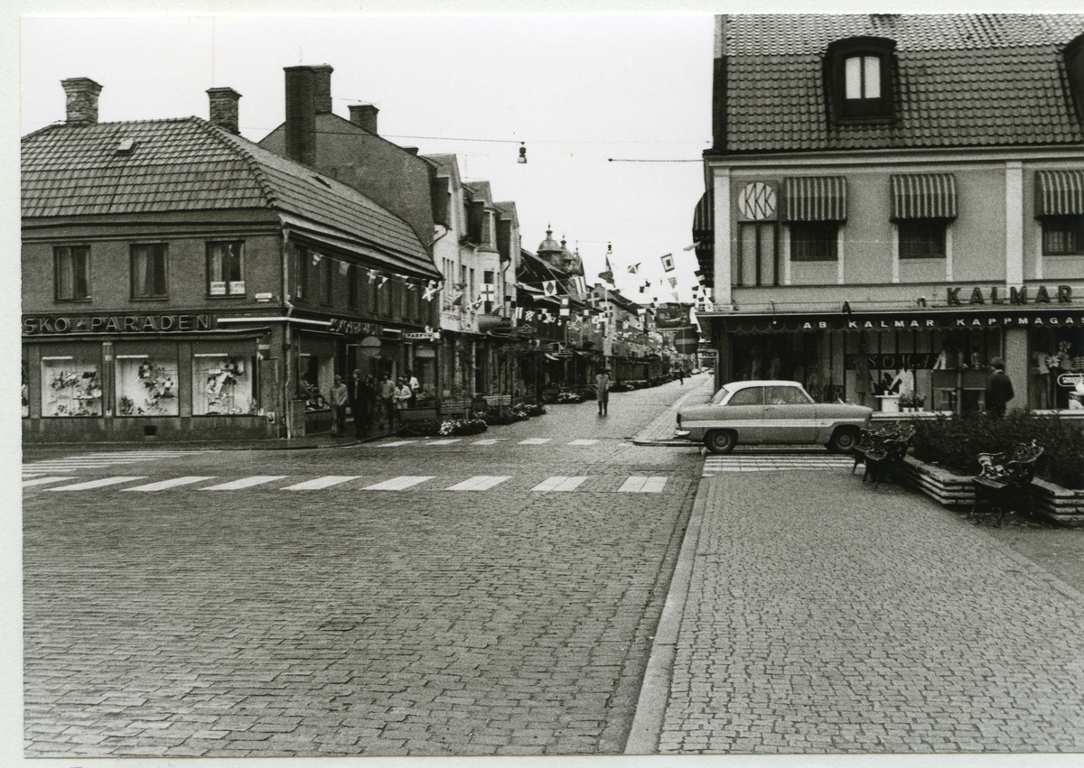 Kvarteret Guldsmeden från Larmtorget. Till vänster kvarteret Blockmakaren. Butiksbyggnader och Storgatan med vimplar.