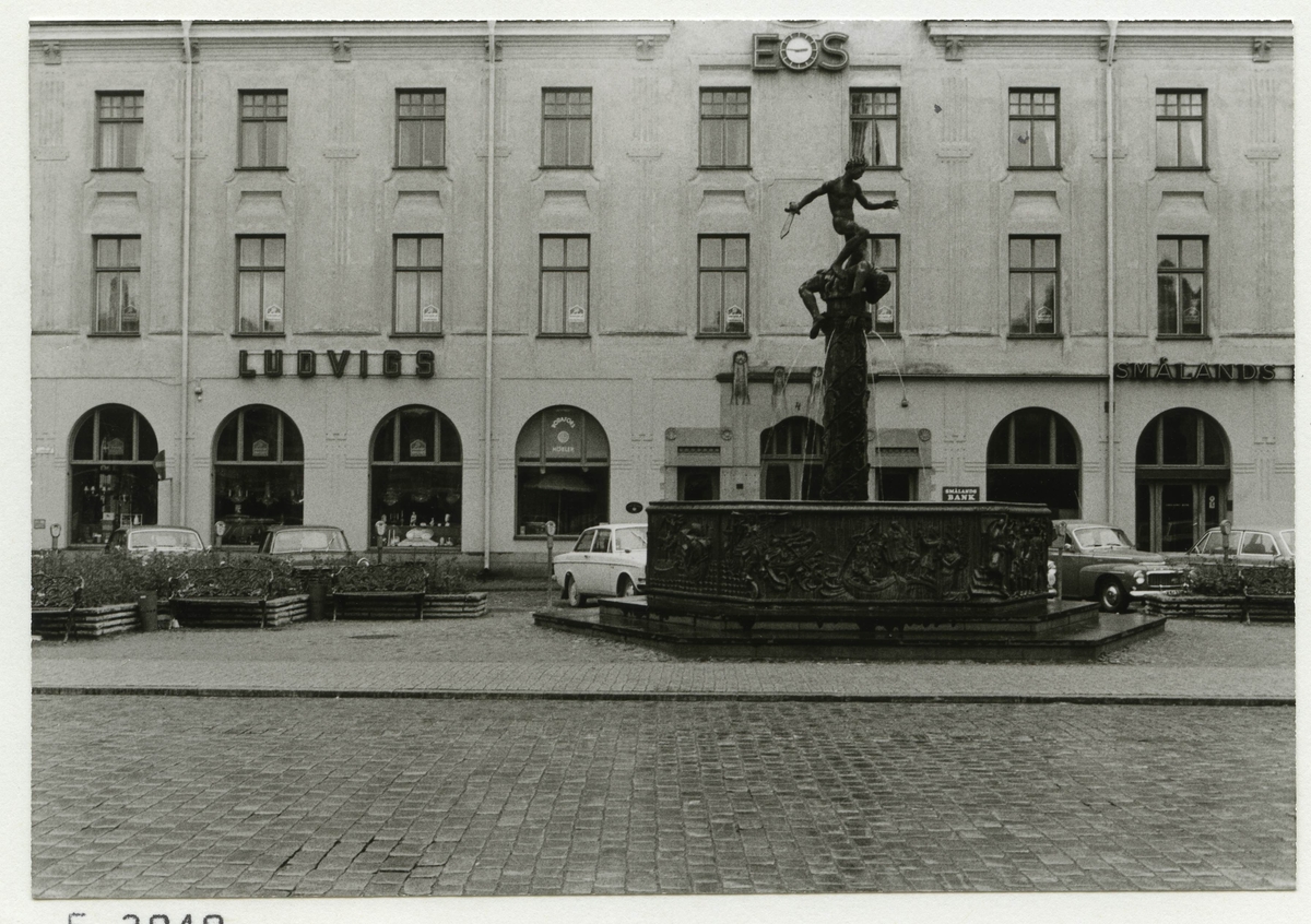Eoska huset på Larmtorget. Storgatan i förgrunden. Vasabrunnen av Nils Sjögren föreställandes David och Goliat på pelaren.