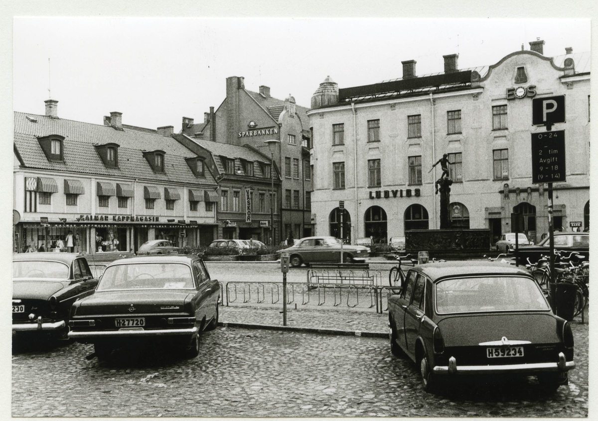 Eoska huset vid Larmtorget. Vasabrunnen av Nils Sjögren föreställandes David och Goliat på pelaren framför huset.