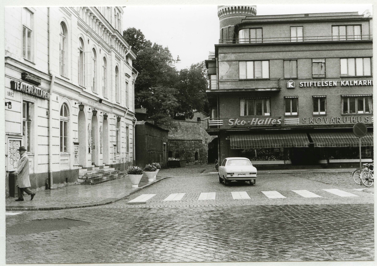 Bild tagen på Larmtorget i Kalmar. Till vänster ser vi Kalmar teater och rakt fram kvarter Blockmakaren och Västerport.