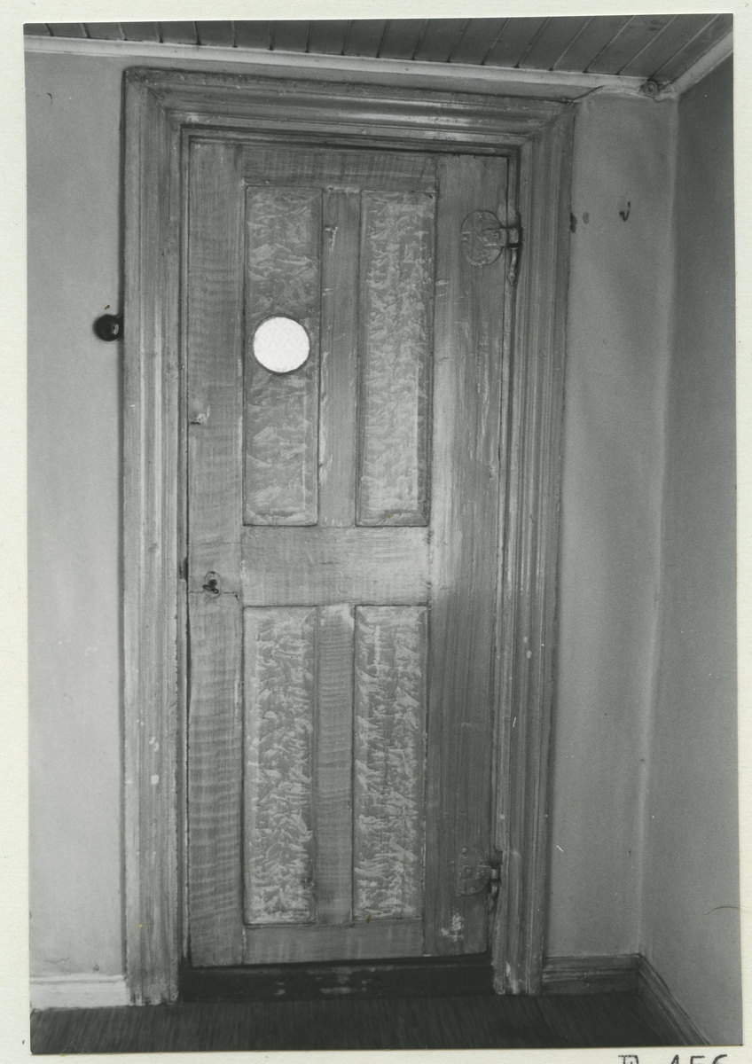 Dörr mot köket. Det runda hålet har etsad glasruta. Grågrön marmorering.