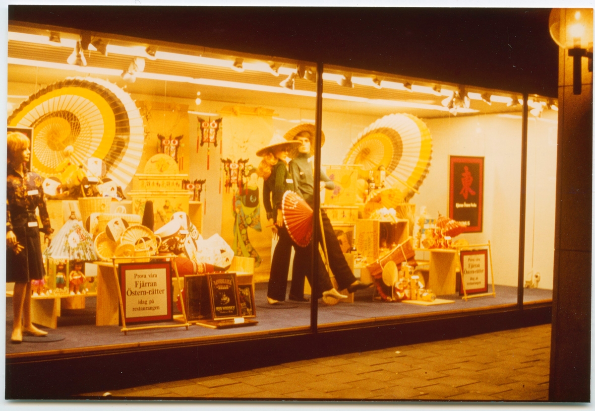 Skyltning i Domus fönster i Kalmar, med temat Fjärran östern.