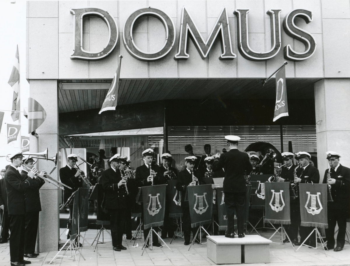 Musikkåren Lyran spelar vid invigningen av Domusvaruhuset på Storgatan, den 10 september 1964.