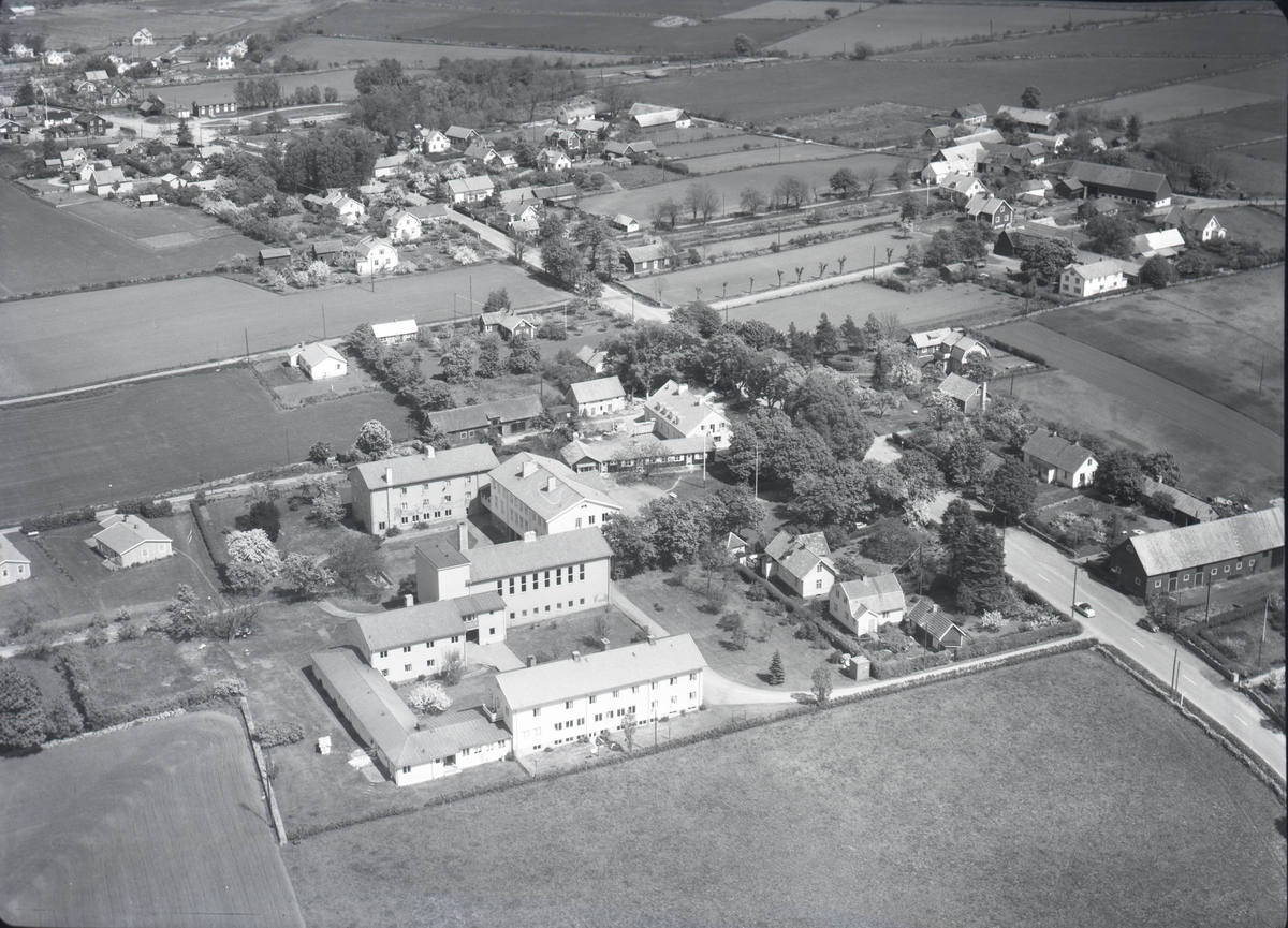 Flygfoto över Skogsby. Samhället med Folkhögskola byggnader och väg.