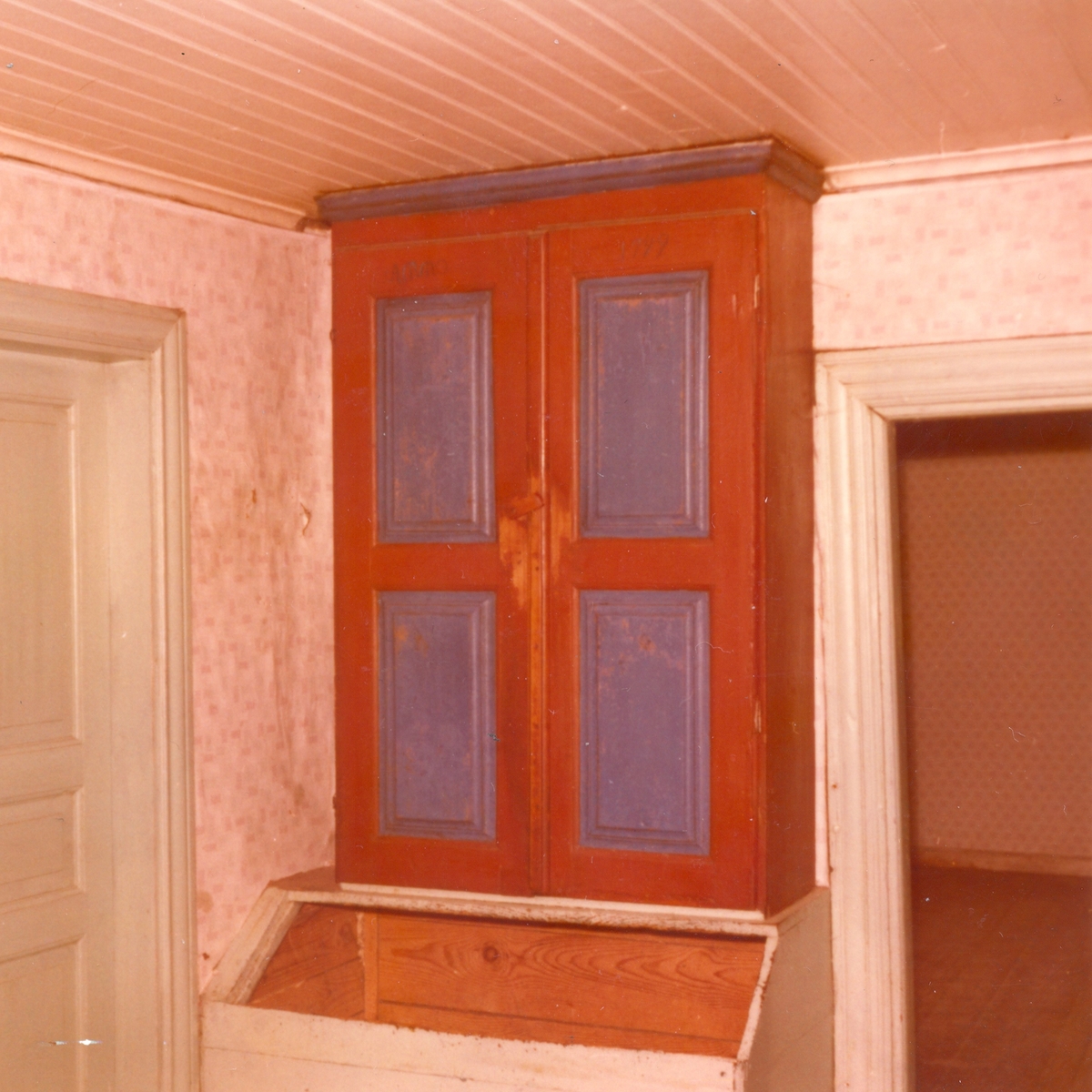 Stommen. Huvudbyggnaden. Kök på bottenvåningen. Väggskåp och "vedskruns". Skåpet har renoverats och står i stora rummet.