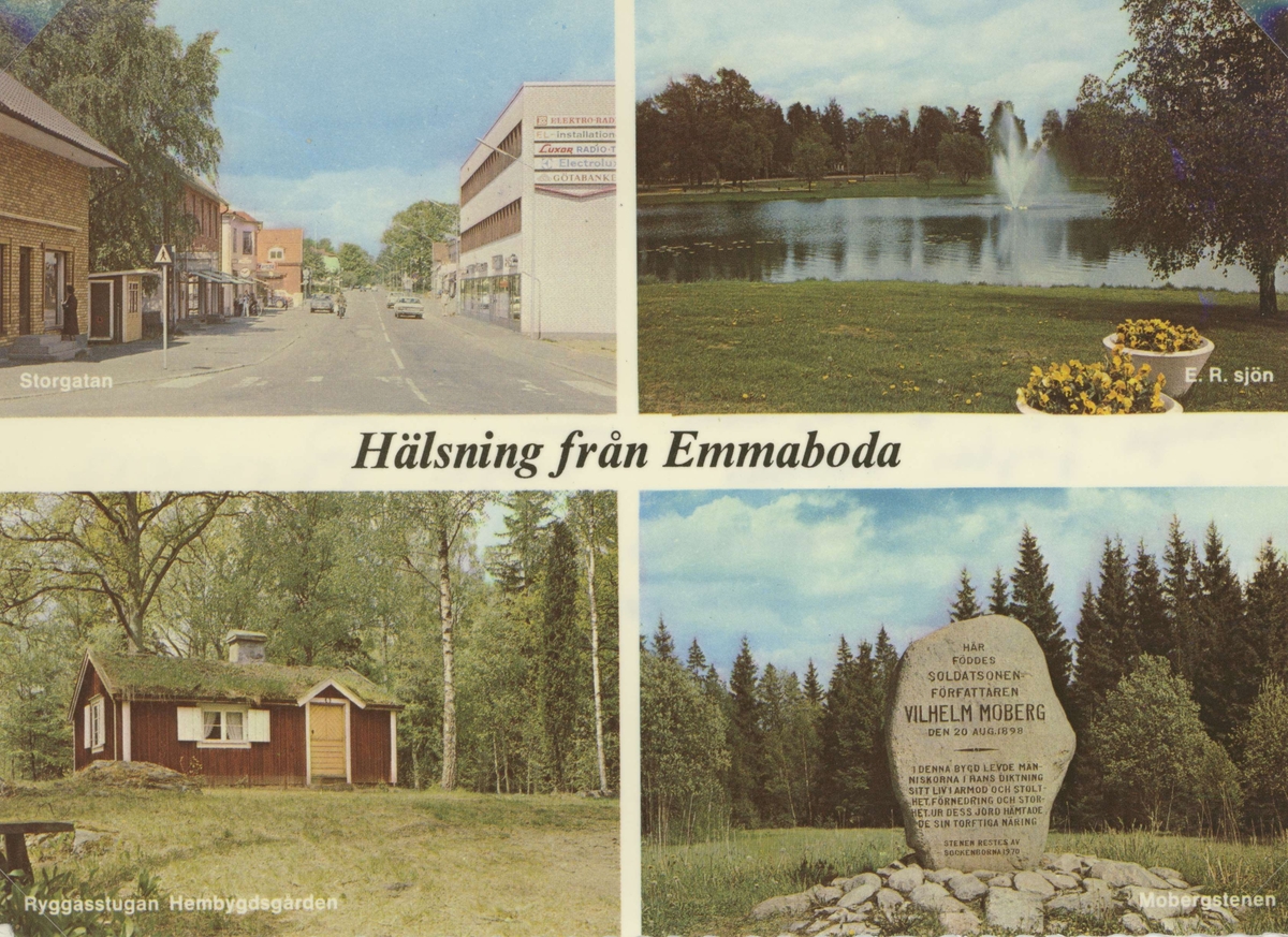 Vykort med motiv från Storgatan i Emmaboda, E.R. sjön, hembygdsgården och Mobergsstenen.