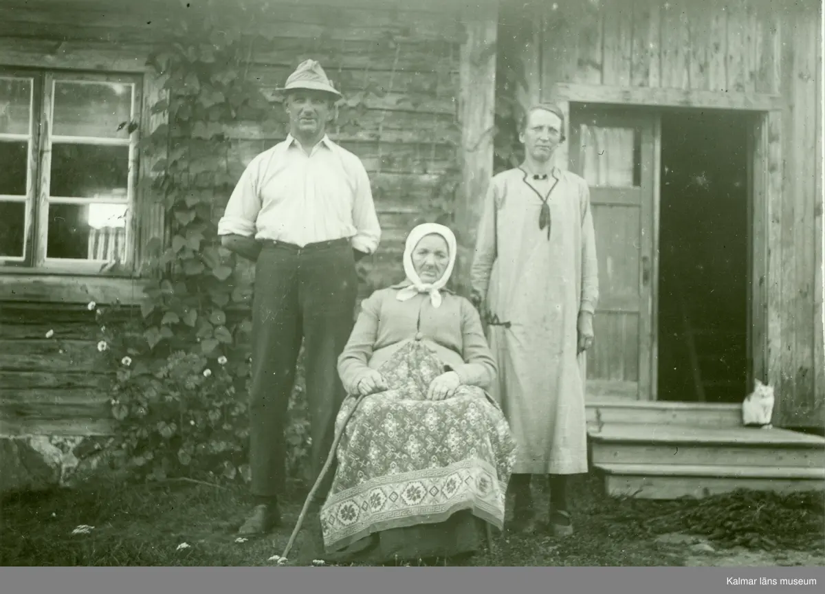 Bilden är fotograferad vid Rammgöl söder om Tryserum, i Ukna. Mina Nilsdotter föddes som Nilsdotter 1849 och hette antagligen Nilsson då bilden togs. Hennes son heter Allan Karlsson och hans fru Agnes Kindkvist.