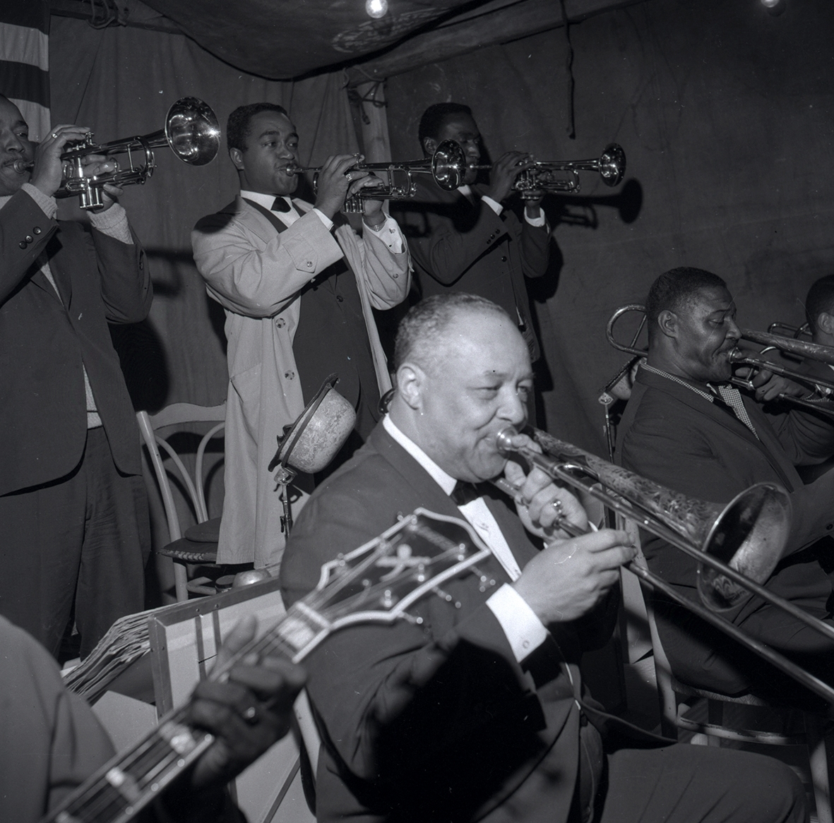 Titel: Musiker som blåser i trumpeter ur Count Basies orkester.