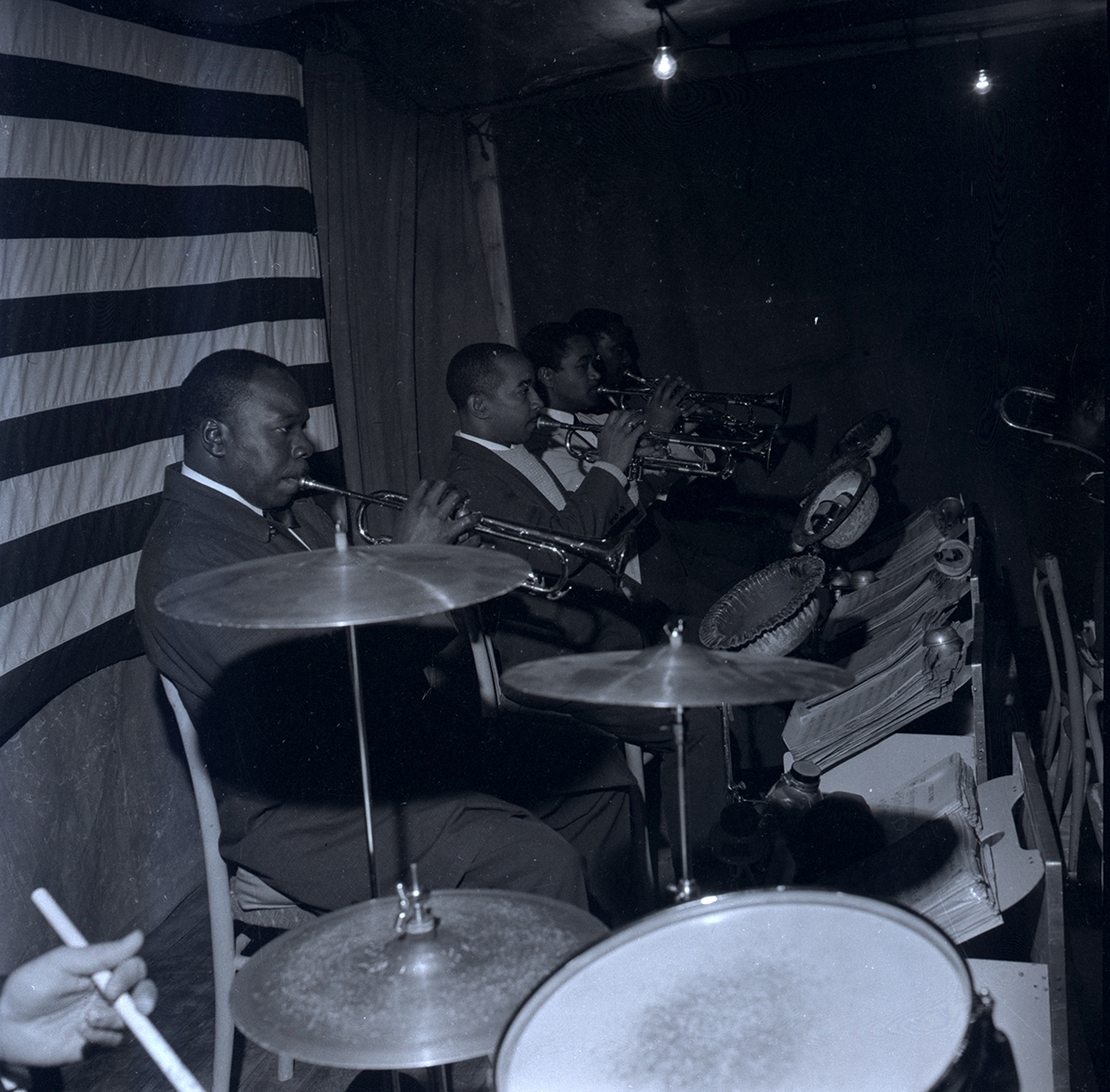 Musiker som blåser i trumpeter ur Count Basies orkester.