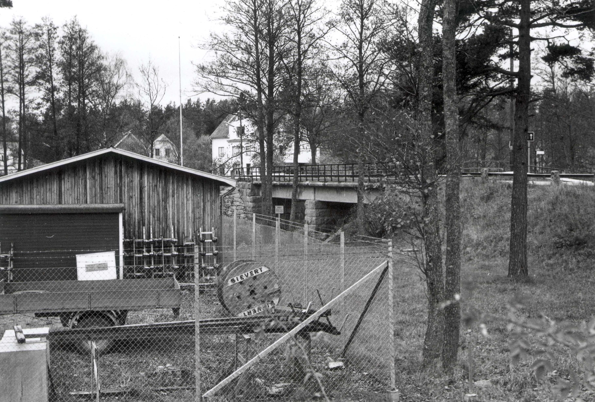 Motiv från Högsby. Ett garage och släpvang. En vägbro i bakgrunden.