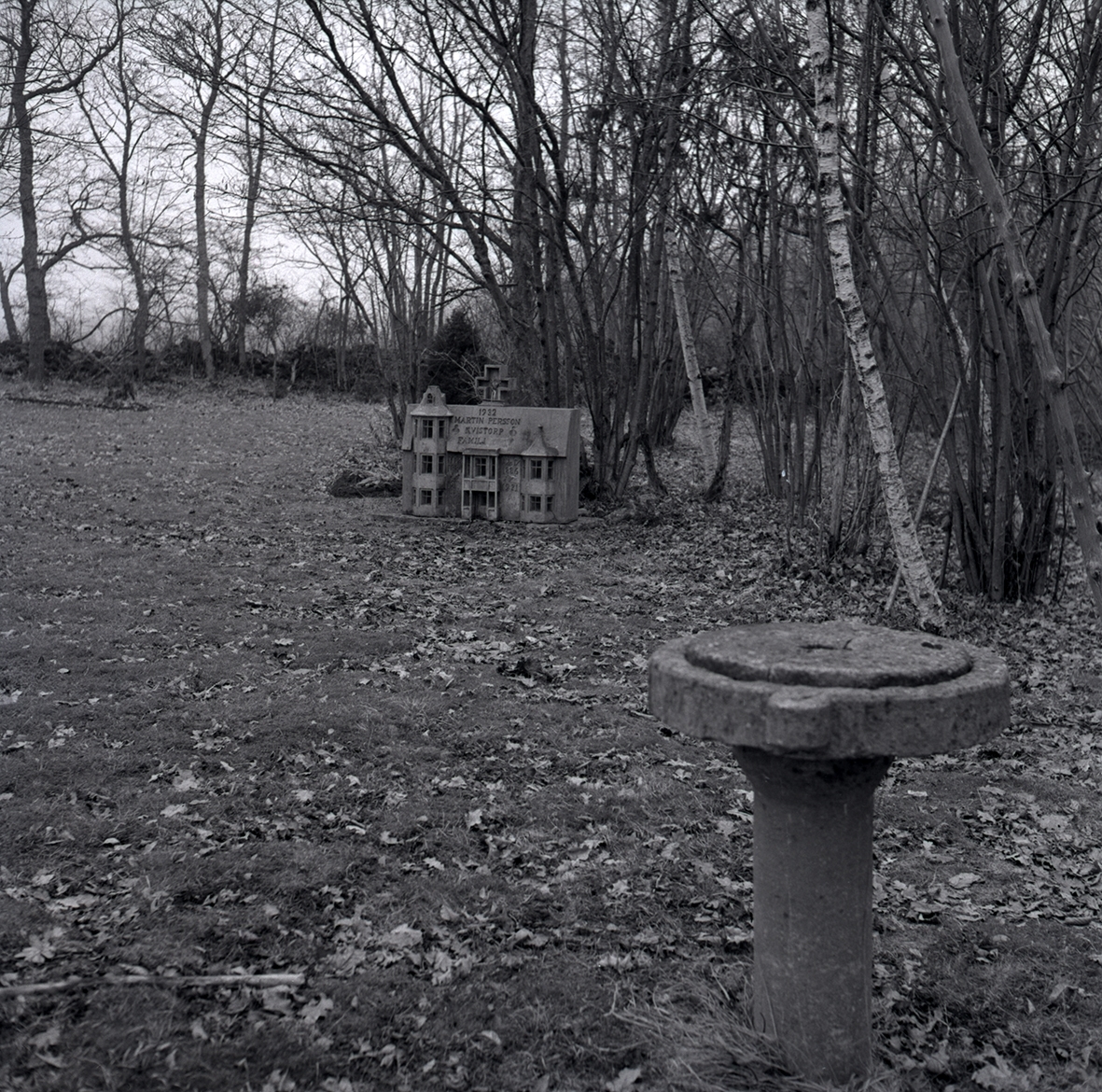 Gravsten i minneslund på Långlöts kyrka som föreställer tornhuset i Quistorp.
