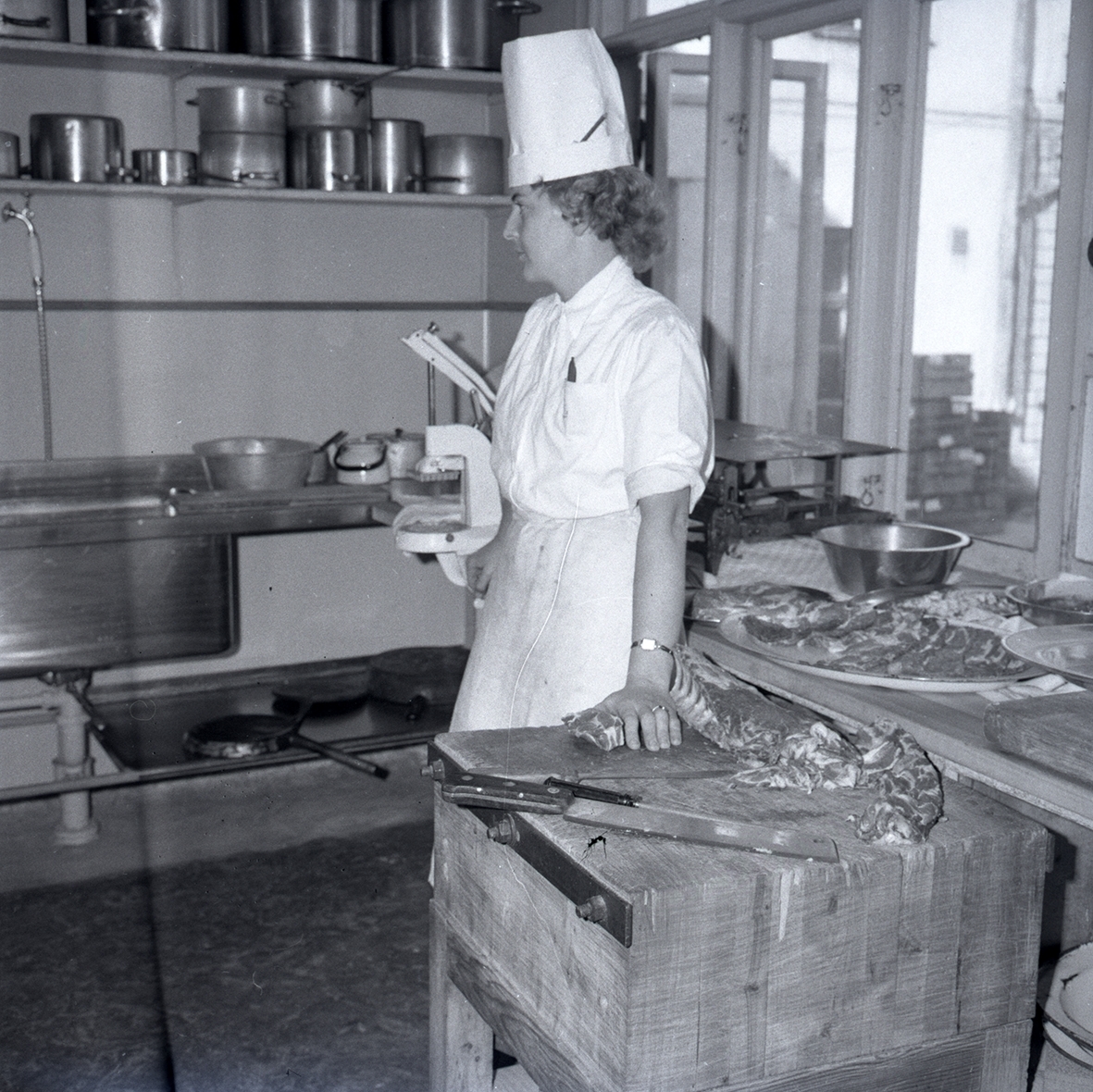 En kvinna i ett kök. På kuvert som medföljde bilden står det: Stadshotellet Englund.