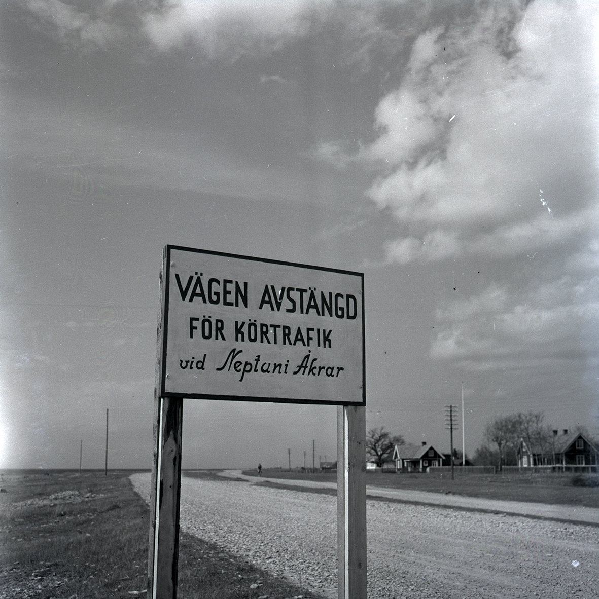 Landshövding Ruben Wagnsson besöker den gamla kustvägen på västra Öland. "Vägen avstängd för körtrafik vid Neptuni Åkrar".
