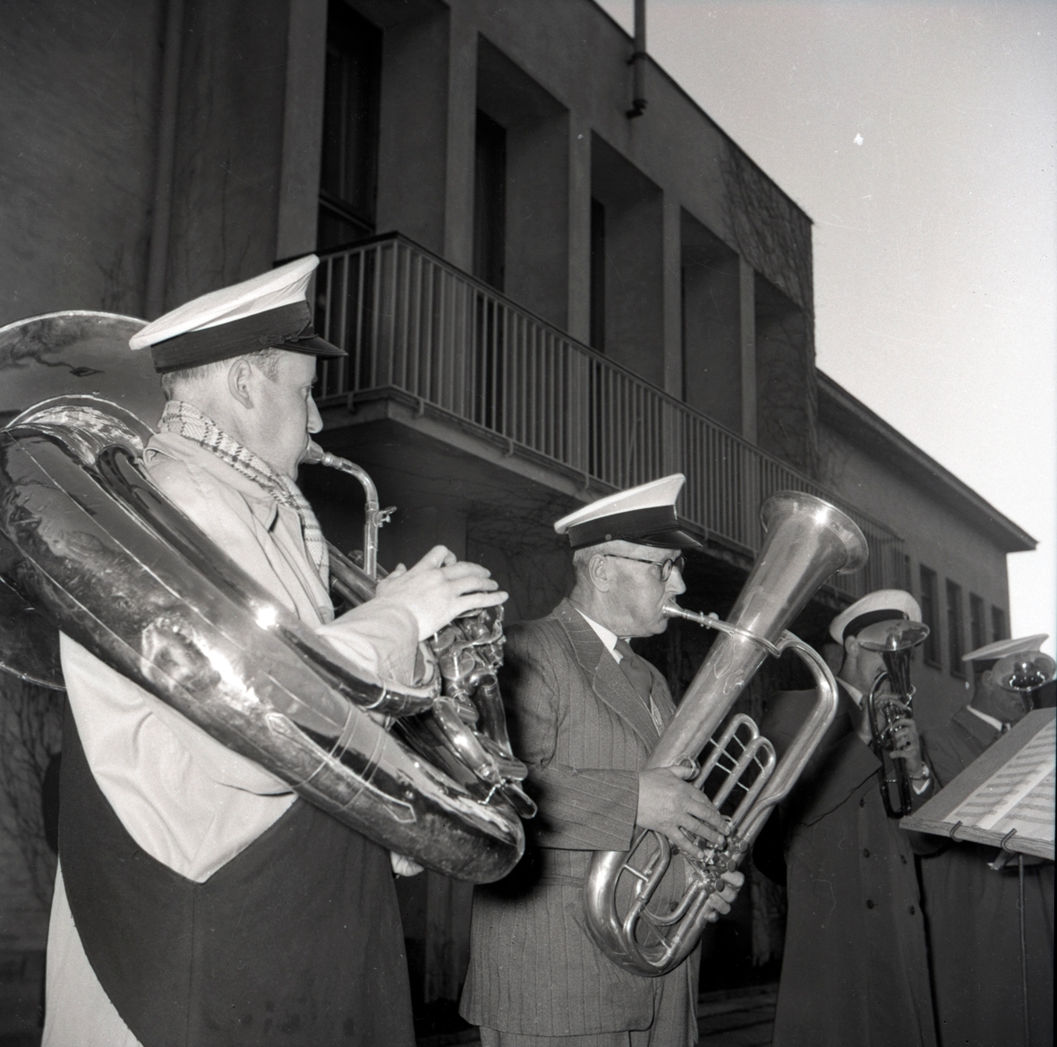 Första majfirande i Borgholm. Blåsorkester underhåller framför stadshuset i Borgholm.