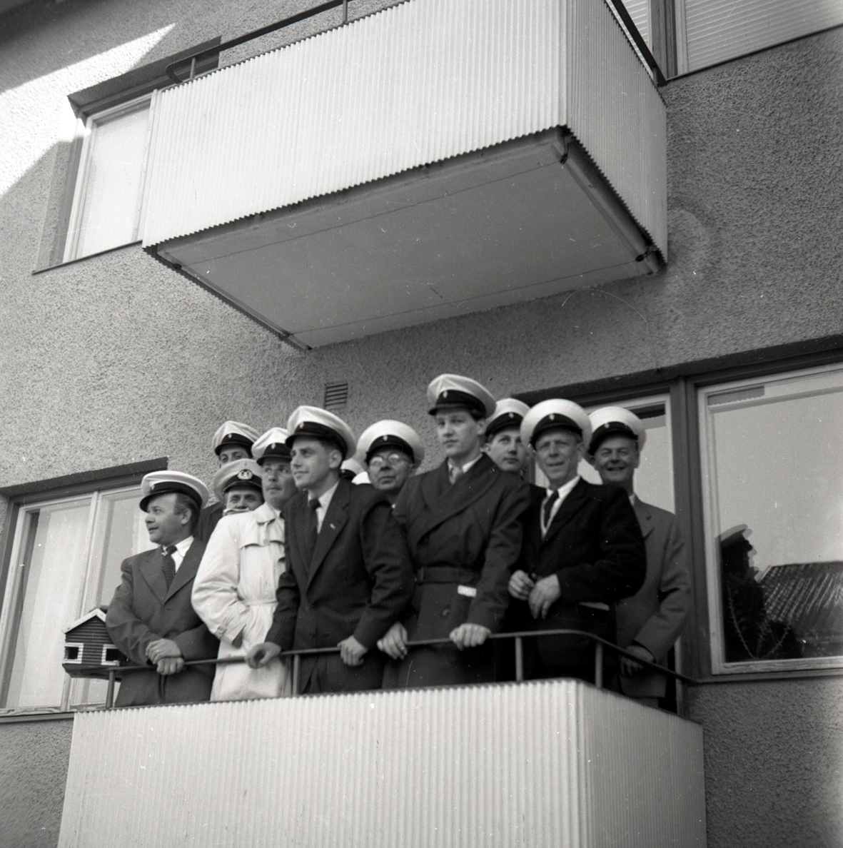 Körmedlemmar på balkong vid första majfirande i Borgholm.