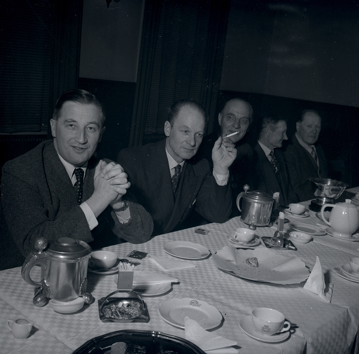 Skytteföreningens årsmöte. Namn som medföljde bild: Ingmar Ekholm. Män i kostym som dricker kaffe.