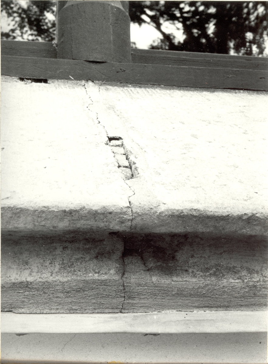Fönsterbänkar av kalksten med brukslagade otäta fogar på Fågelfors kyrka.