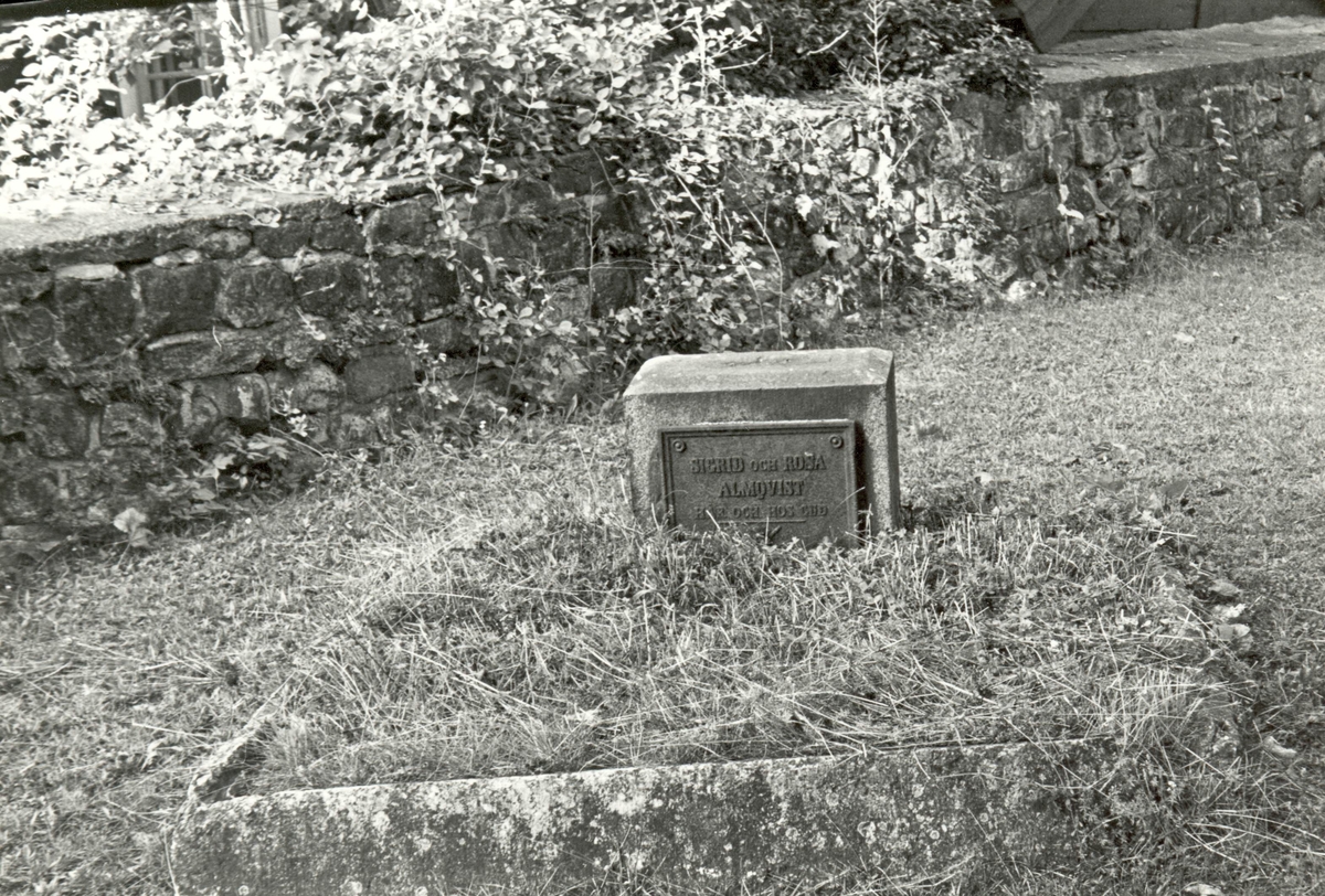 I västra kanten finns ett rektangulärt, grovhugget granitfundament: h. 52 cm, b. 35 cm, l: 60 cm. Översidan är svagt avfasad mot ytterkanterna. På fundamentets översida finns järndubbar kvarsittande. På fundamentets östra sida finns en gjuten järnplatta med texten: Sigrid och Rosa Almqvist här och hos Gud.
