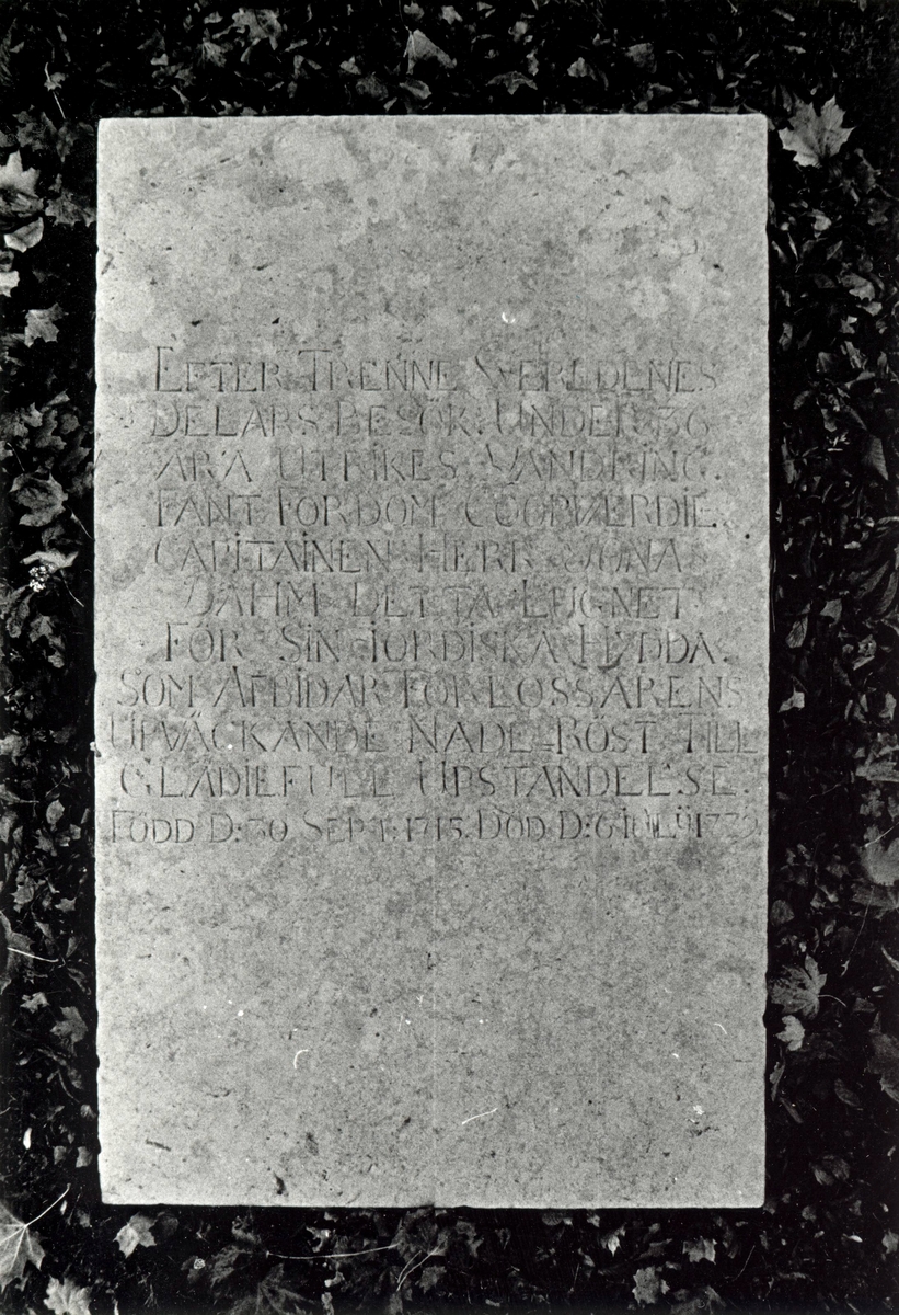 Text:" Efter trenne werldenes delars besök under 36 åra utrikes wandring fant fordom coopvaerdie capitainen herr Jonas Dahm detta lugnet för sin jordiska hydda som afbidar förlossarens uppväckande. Nåde=röst till glädiefull uppståndelse.