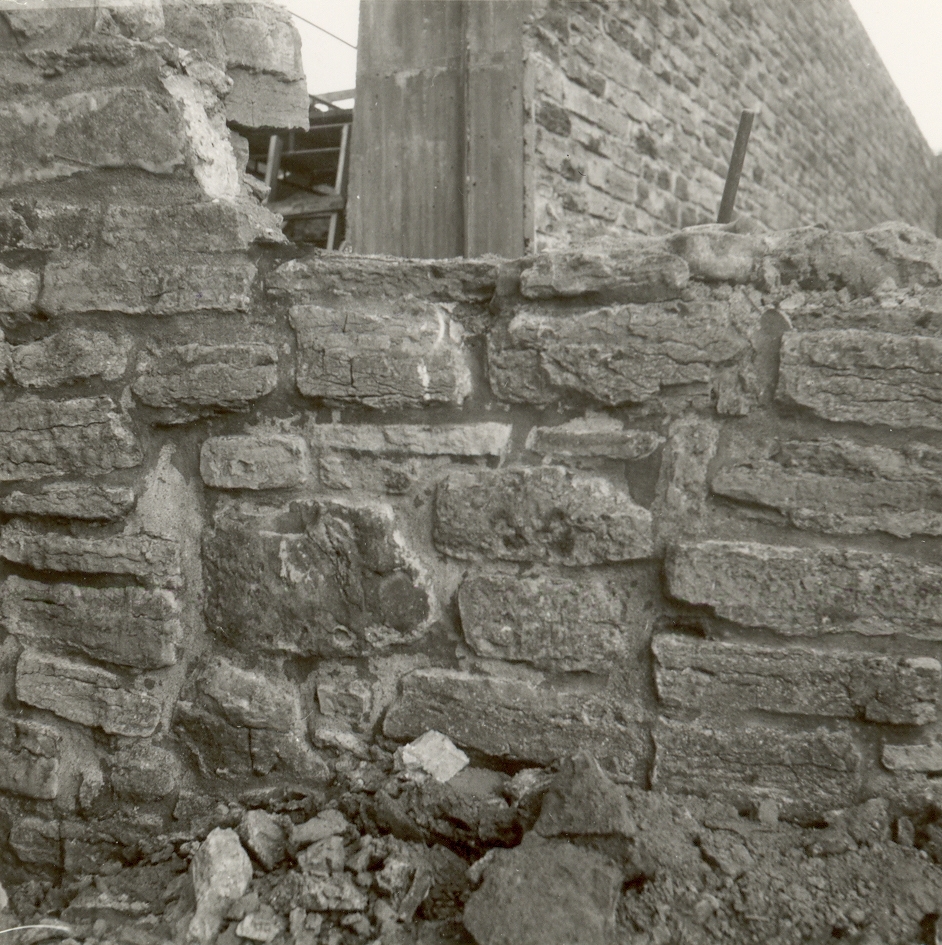 Nordligaste kontreforen, söder om ingångsvalvet. Den mot söder vettande sidan med igenmurad öppning.