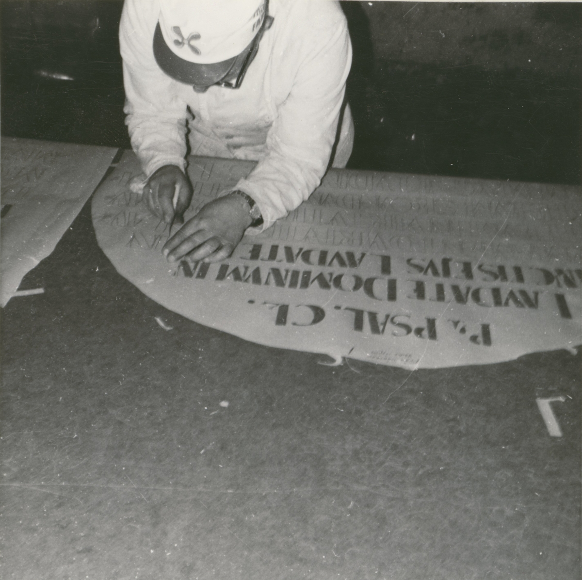 Slottskyrkans renovering. Utskärning av mall till dekoration.