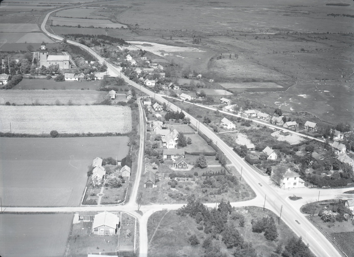 Flygfoto över Resmo. Samhället med kyrkan och hus samt vägar.