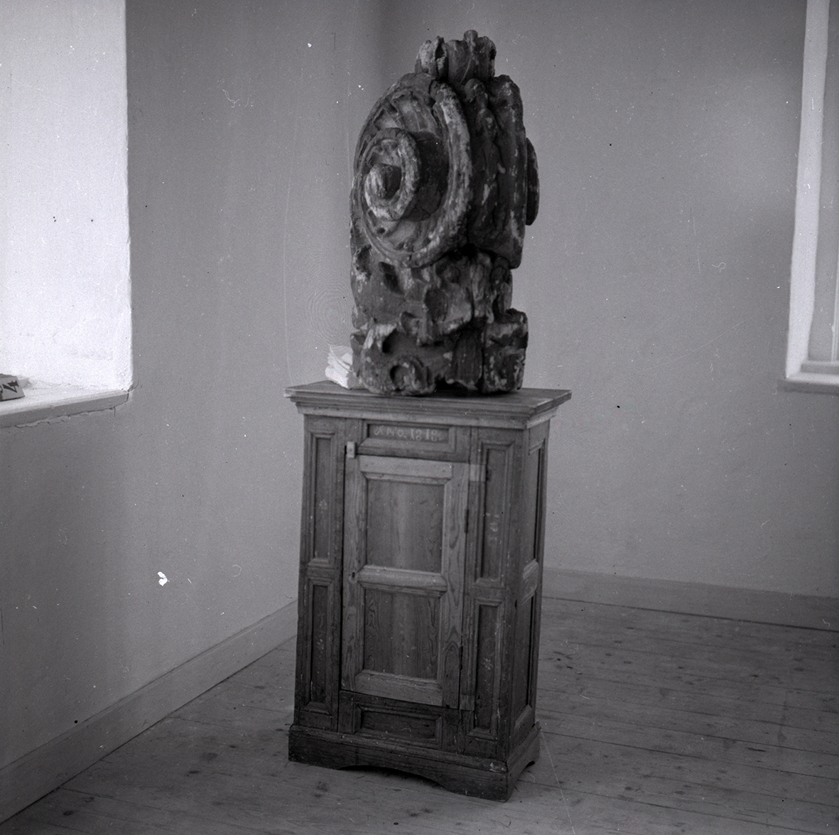 Ett skulpterat trästycke med en så kallat volut (spiralornamentet). Kan mycket väl komma från ett vrak/skepp. Från hembygdsmuseet i Föra.