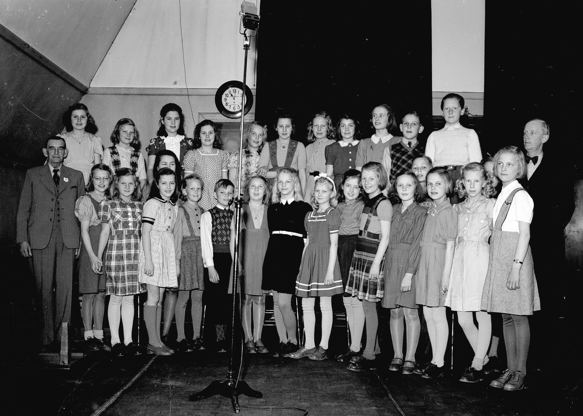 Röster i radio. Radiostudion: skolklass sjunger.