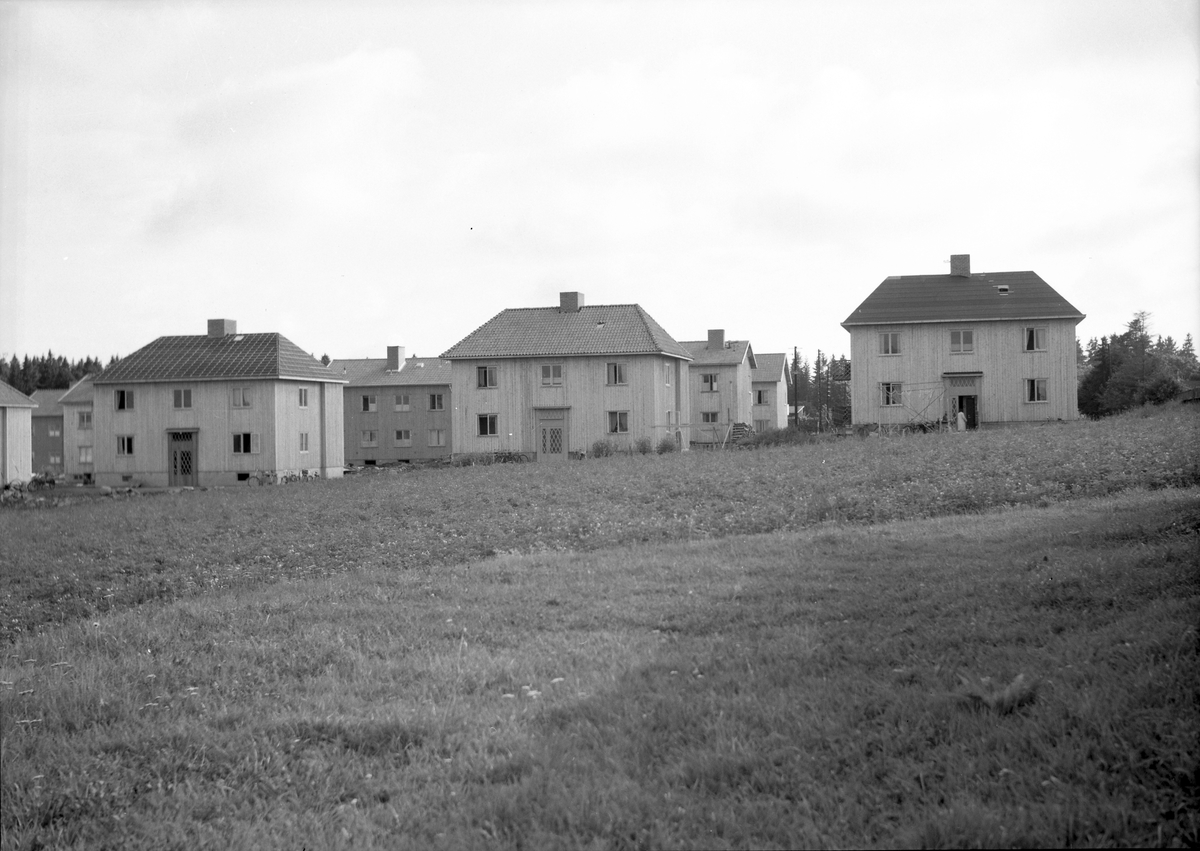 Fotot är taget från dåvarande jordbruksmarken vid Vallongatan. Den första raden av hus (kvarteret Rönnen) har adress Birkagatan, som ligger på andra sidan av husen.