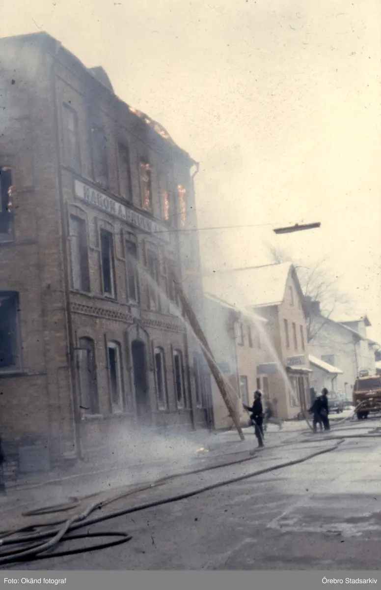 Brandmän släcker byggnad i Hallsberg, 1960-tal