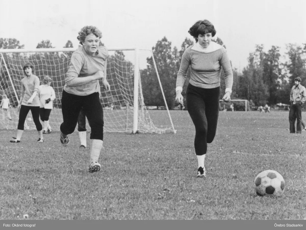 Kvinnliga fotbollsspelare jagar bollen, 1970-talet