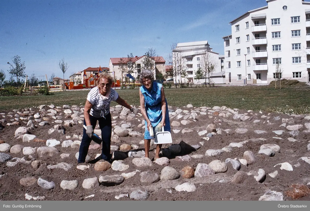 Bygger en labyrint av sten i Ladugårdsängen, 1992