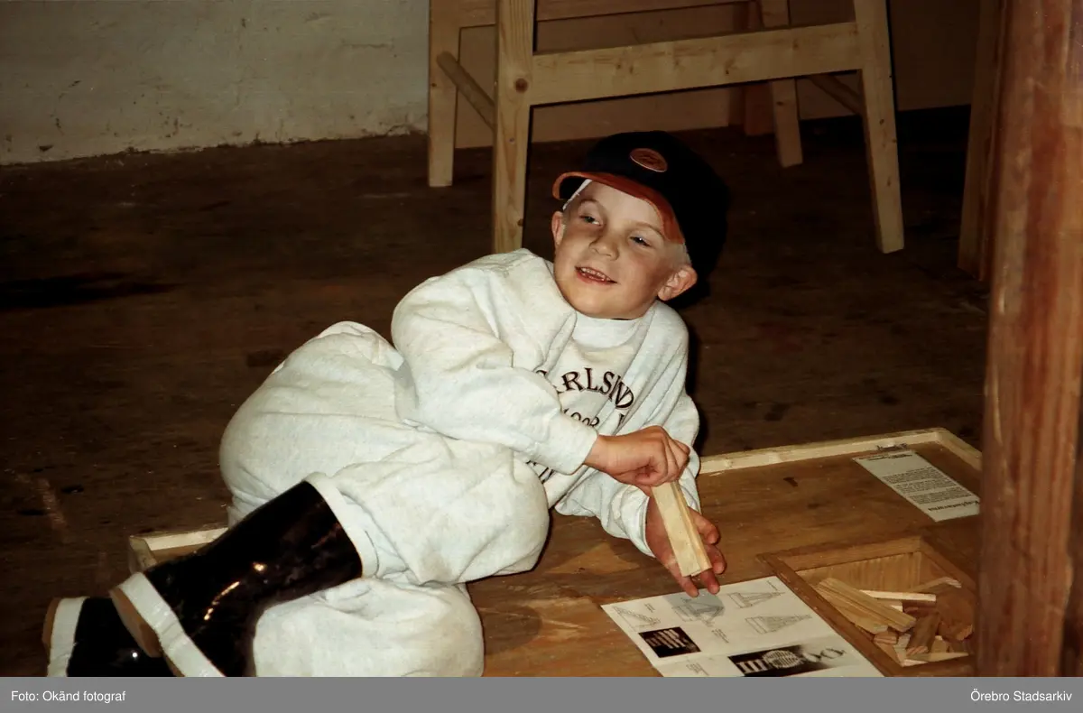 Avslappnad besökare bygger med jenga på Tom Tits i Tekniska kvarnen, 1997