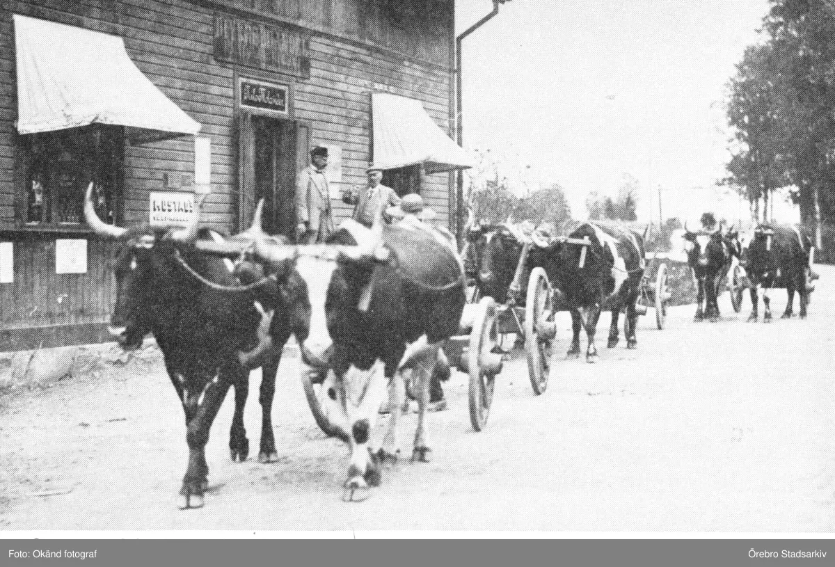 Oxspann från Bysta herrgård utanför Molanders diversehandel, 1915