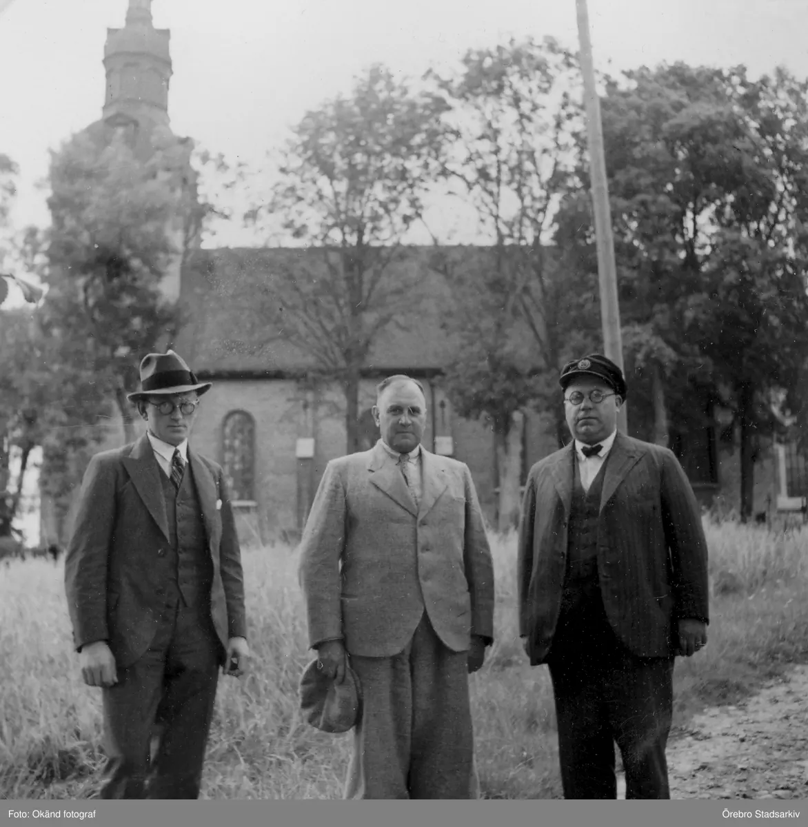 Tre män framför Askersunds landsförsamlings kyrka, 1936-08-14