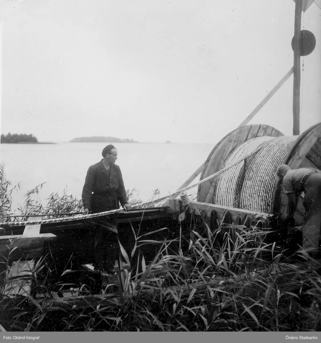 Man vid kabelrulle vid nedläggning av kabel till Vinön, 1952-08-11