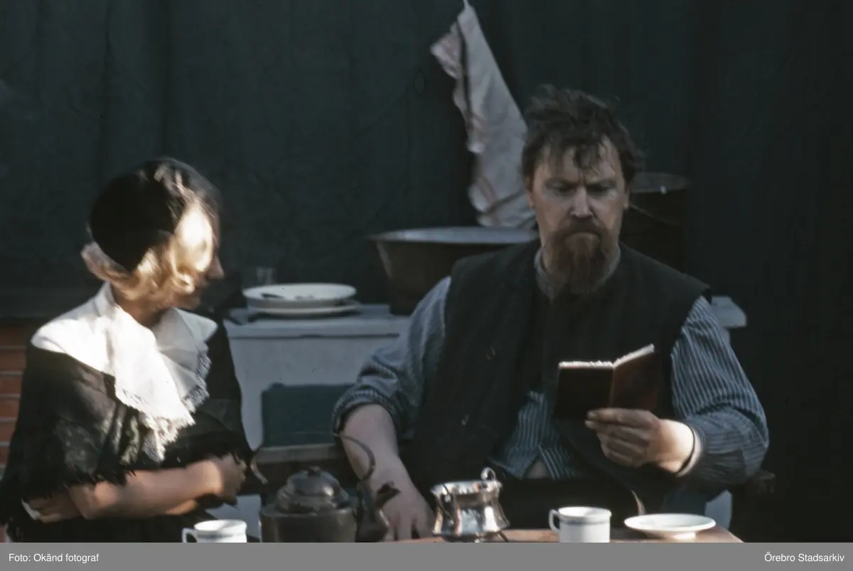 Kaffedrickande på scen under teaterföreställning, 1970-tal