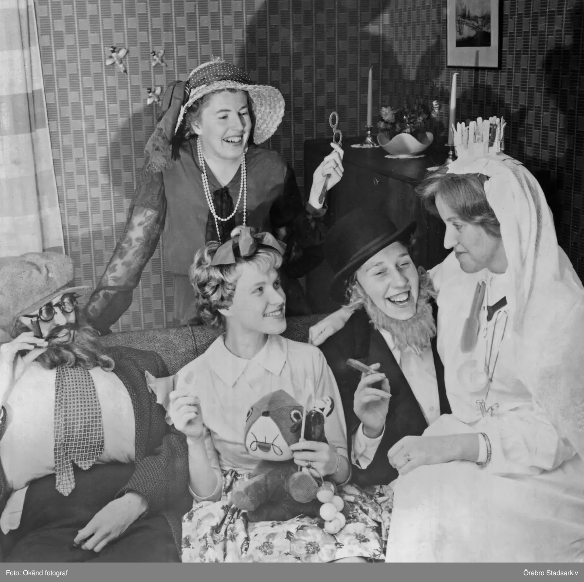 Glada kvinnor i soffa på möhippa, 1950-tal