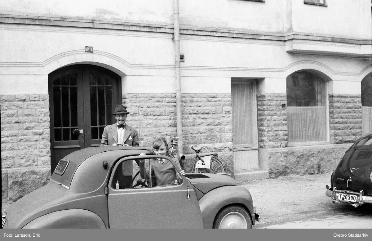 Fiat 500 och Volvo PV 444 parkerade på Rådmansgatan, 1950-tal