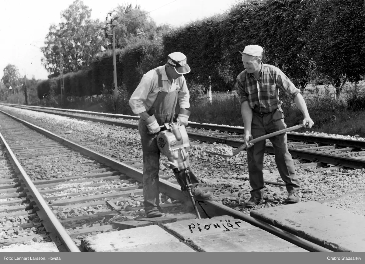 Järnvägsarbetare med slagborren Pionjär och fyller med makadam, 1969,
