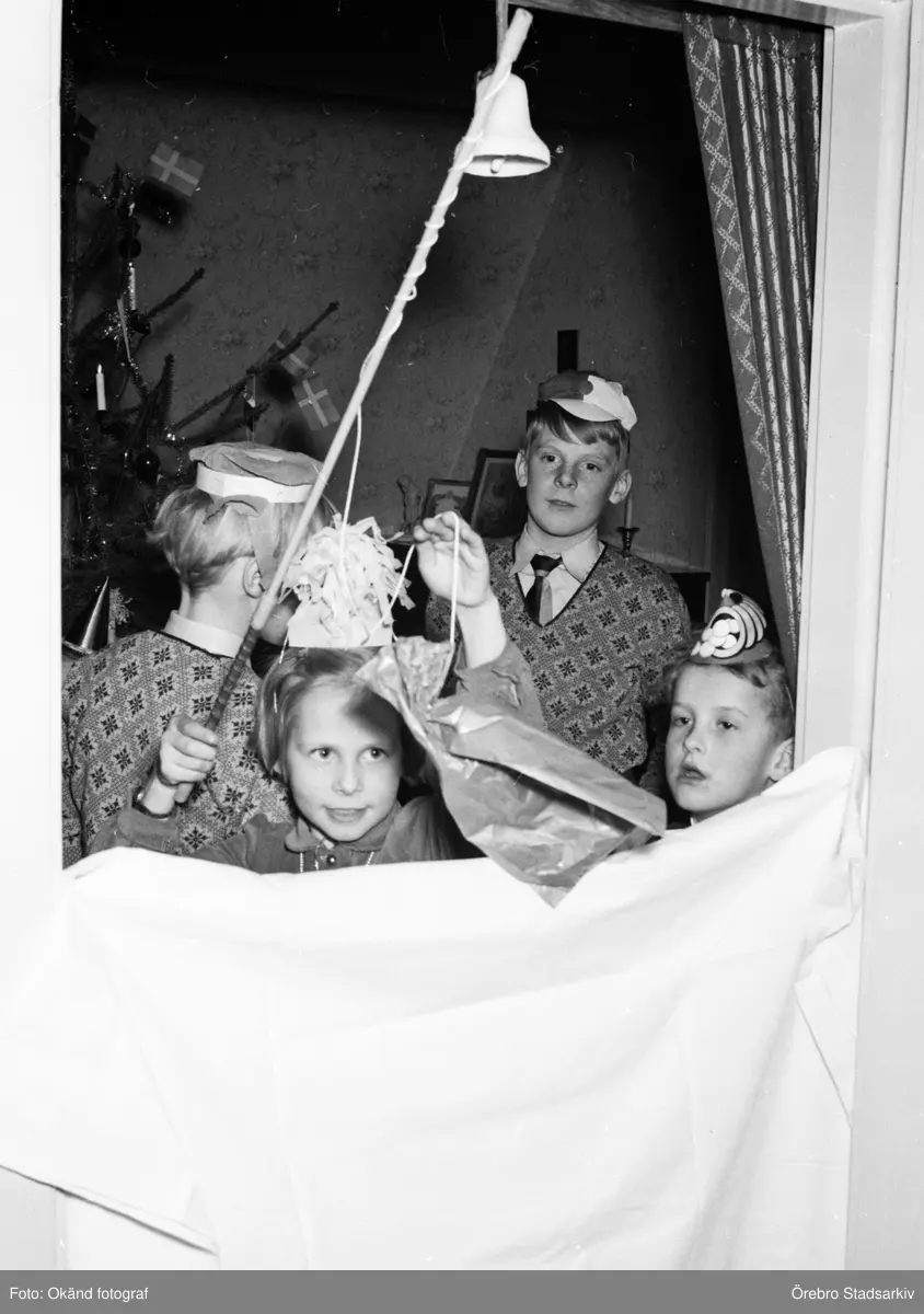 Barn vid fiskdamm vid julgransplundring, 1955