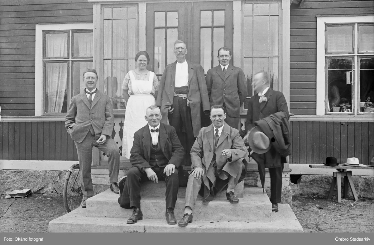 Familjegrupp sitter på trappan, 1920-tal