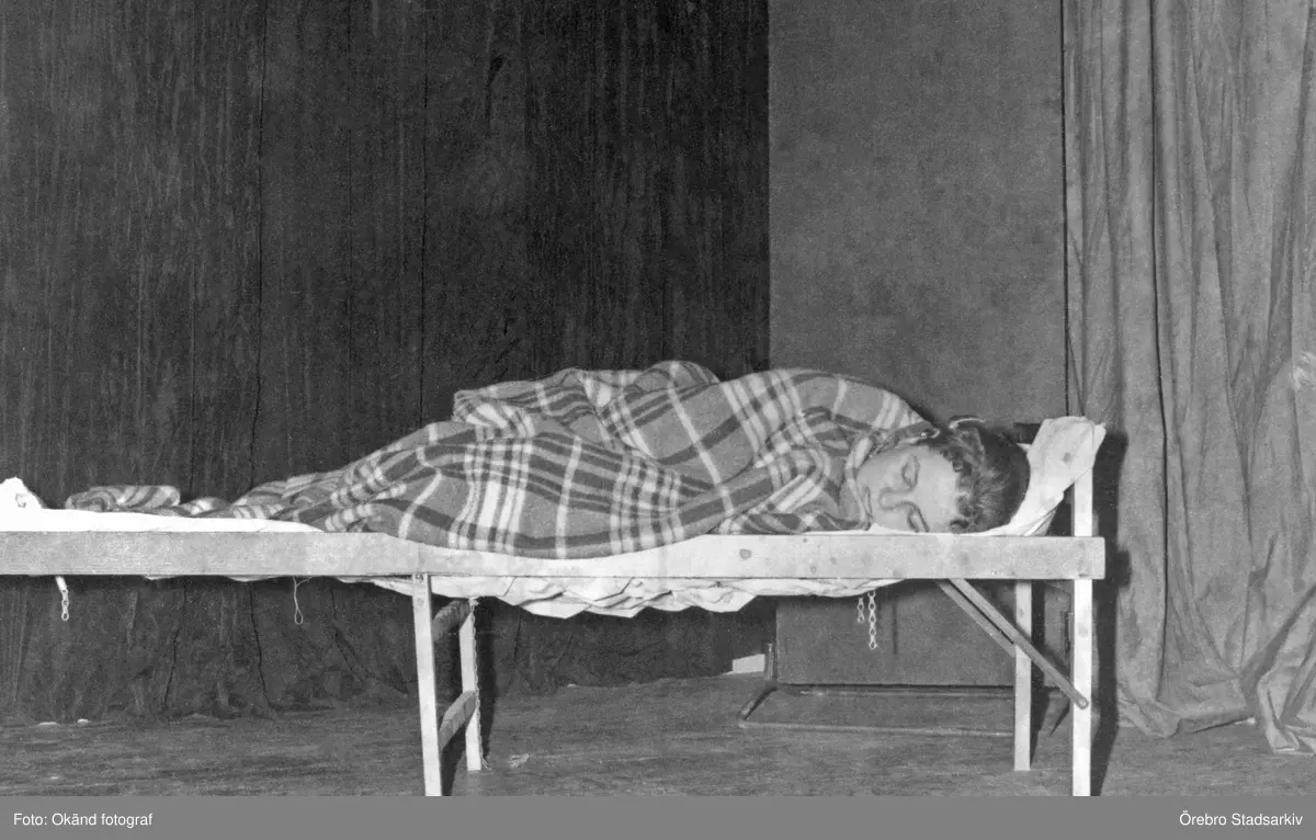 Kvinna sover i säng på scen 1959