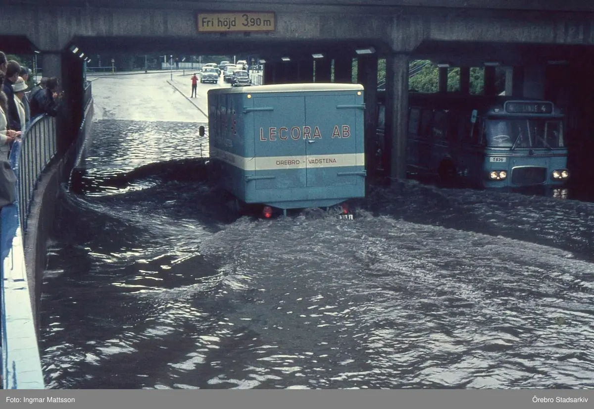 Lastbil kör under vattenfylld bro, 1965