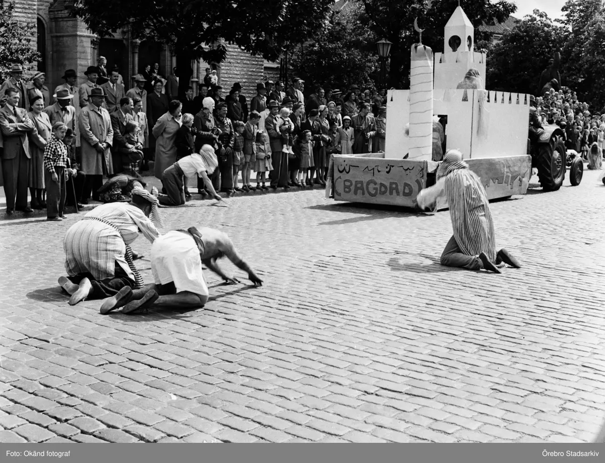 Traktor kör vagn framför tjänare på Barnens dag, juni1953